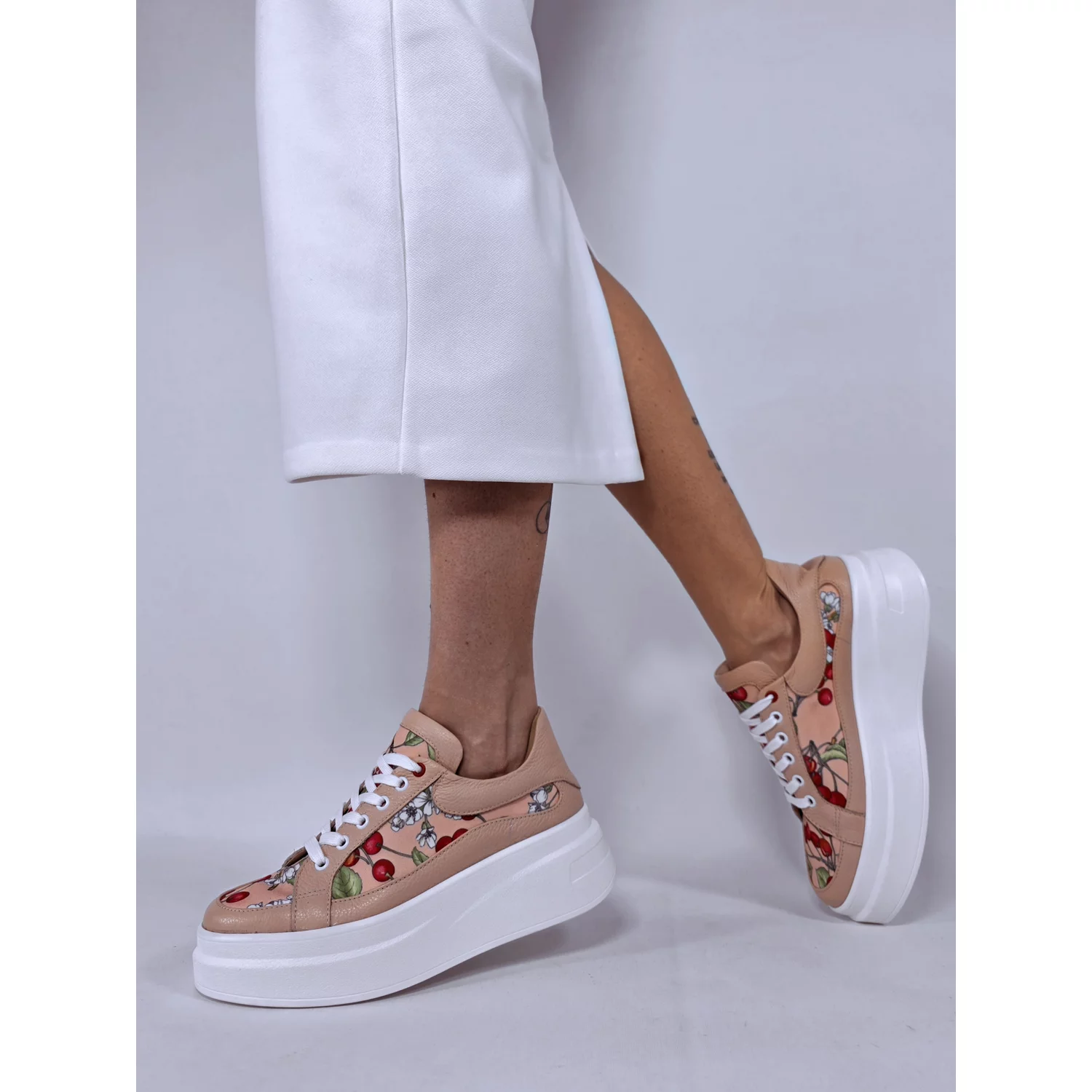 Pantofi casual Piele Naturala Bej roze cu imprimeu color Cherry