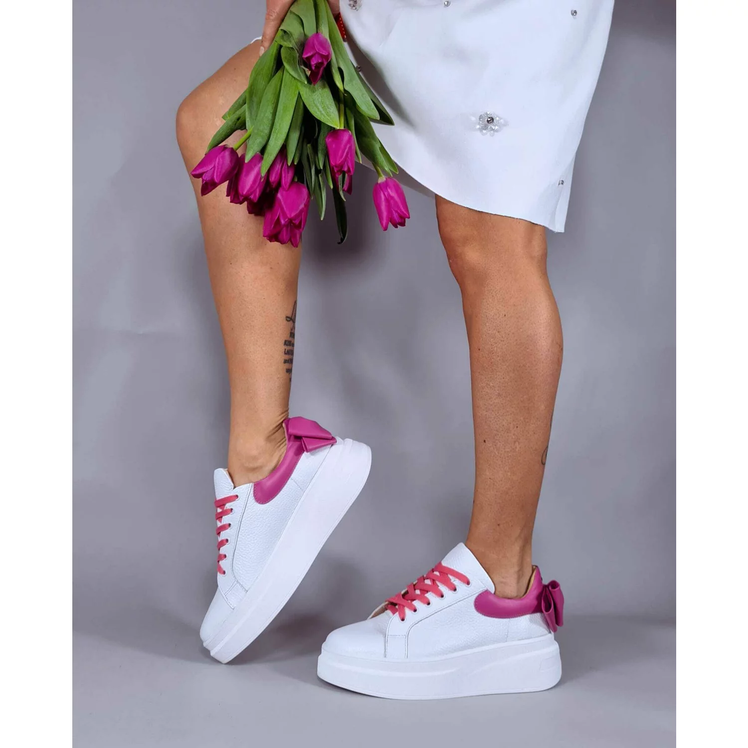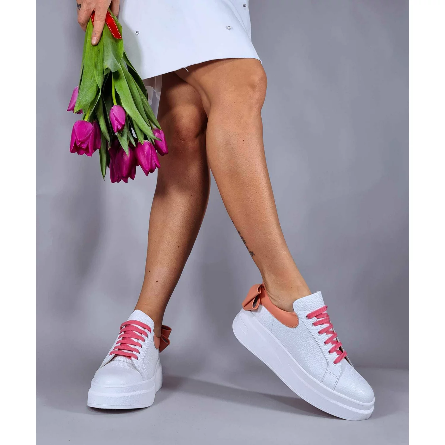 Pantofi casual Piele Naturala albi cu roz Bow
