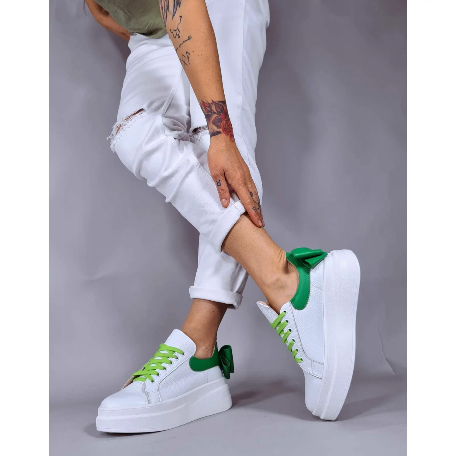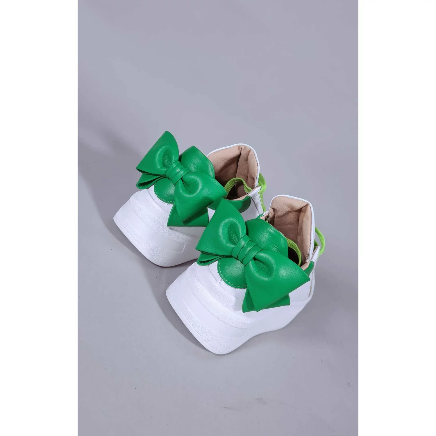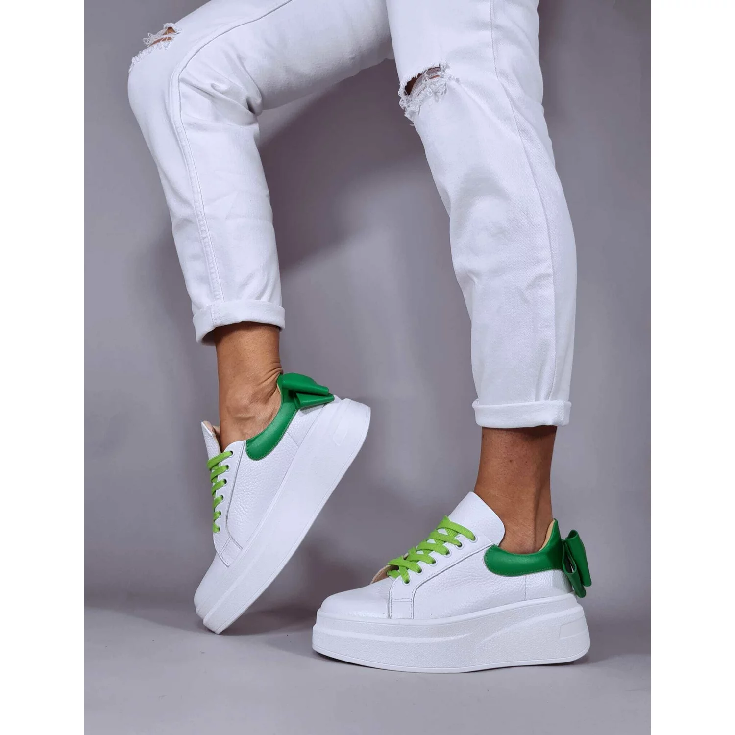 Pantofi casual Piele Naturala Albi cu Verde Bow